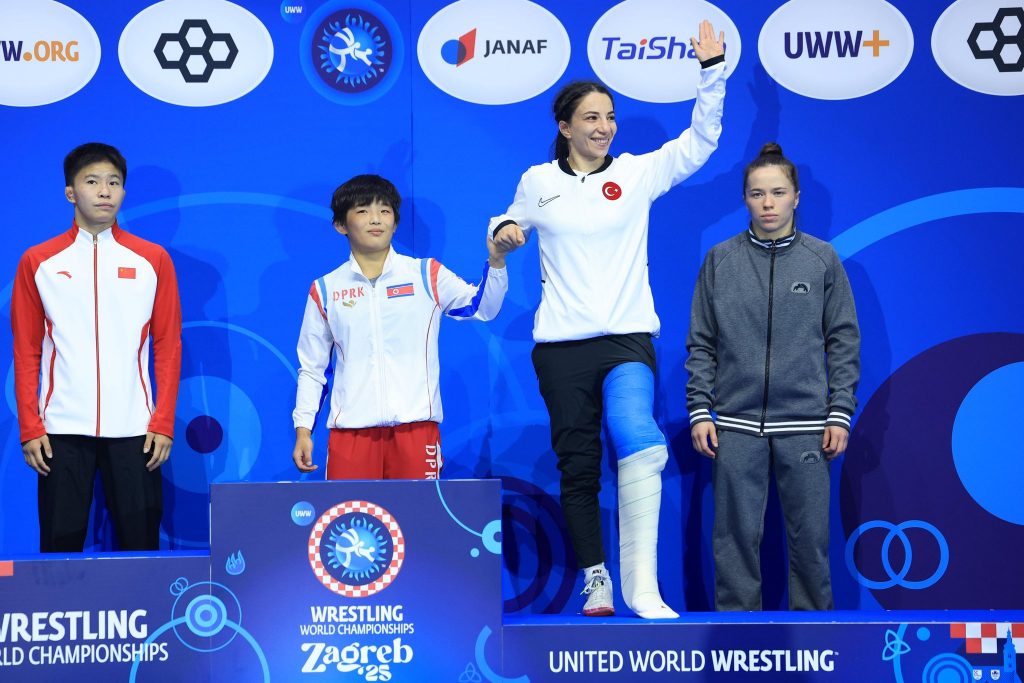 2025 Dünya Güreş Şampiyonası‘nda kadınlar 50 kiloda mücadele eden Evin Demirhan Yavuz, bronz madalya elde etti. Evin, bacağı sargılı katıldığı madalya töreninde kürsüye rakiplerinin kucağında çıkabildi